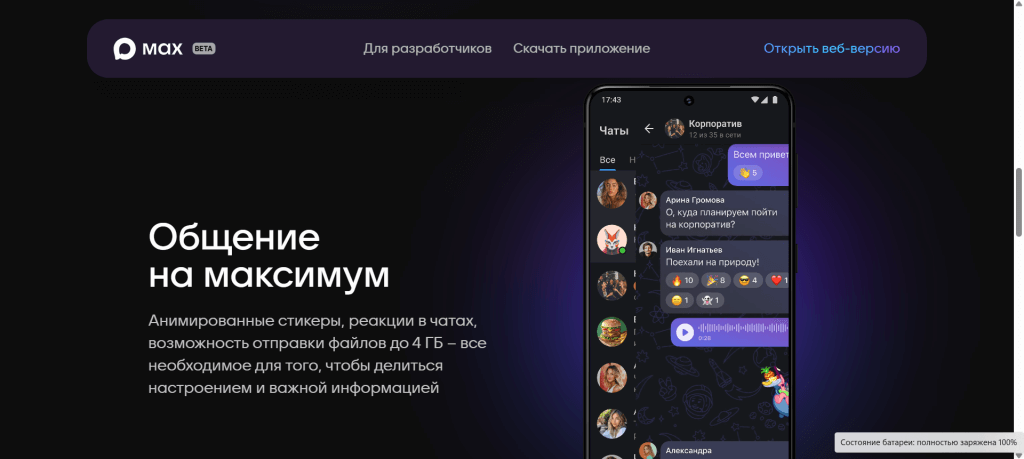 MAX одинаково удобно использовать на смартфонах, компьютерах и в браузере. Синхронизация между устройствами позволяет оставаться на связи и не терять важную информацию. Это делает приложение универсальным инструментом для личного и делового общения.